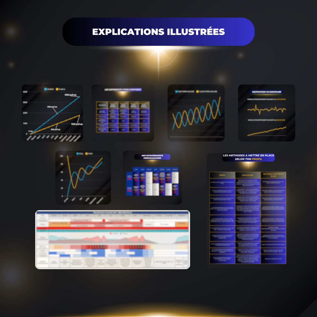 Tu ne te contenteras pas de suivre des vidéos et des instructions. Pour t'aider à mieux comprendre chaque aspect de l'entraînement, je mets à ta disposition des schémas et des tableaux explicatifs détaillés qui illustrent mes méthodes de manière visuelle et pratique.