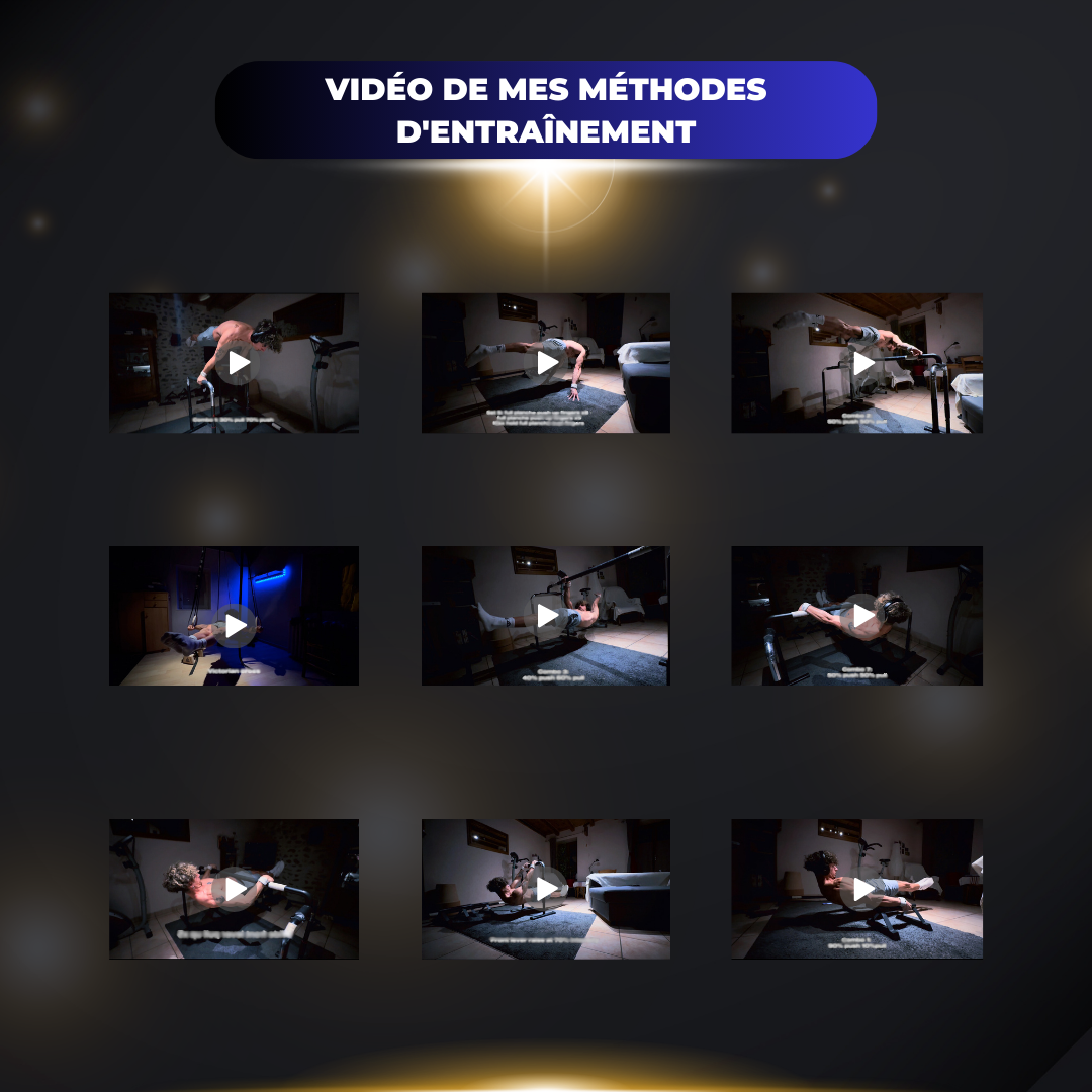 Plonge dans un contenu exclusif avec plus de 30 minutes de vidéos détaillées et plus d'une dizaine de méthodes testées et approuvées pour transformer ton entraînement. À travers des démonstrations, je te montre comment j’ai structuré mes propres séances pour atteindre un niveau de force et d'endurance mondialement reconnu.